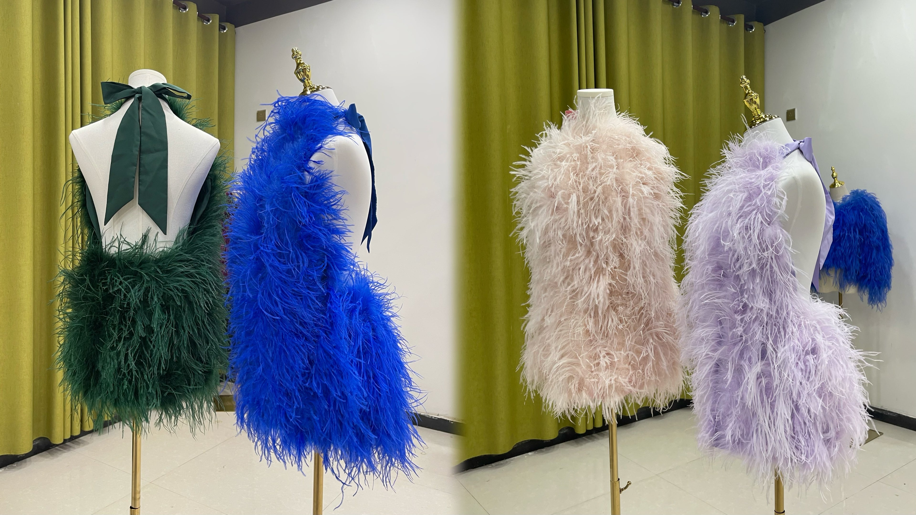 Dress, women's off-shoulder skirt, short skirt, ostrich feather skirt, long feather skirt, sexy short skirt, wholesale, custom size available