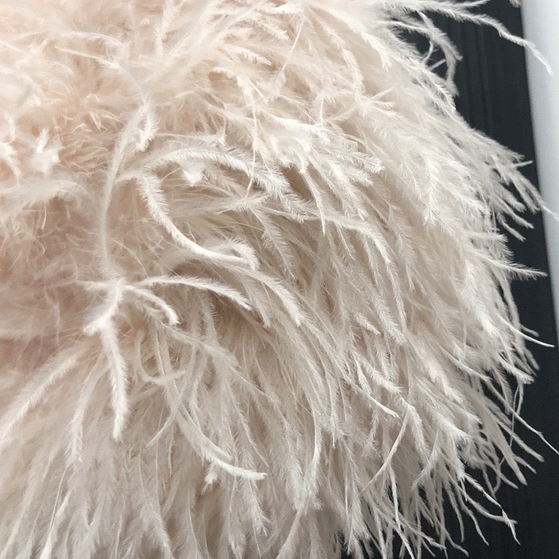 This vest is made of natural ostrich feathers, hand-woven and then sewn on the fabric. This tube top vest is elastic on the top and bottom, and the feathers are very soft and light.